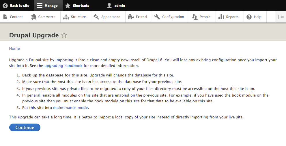 Migrate Upgrade is a simplified version of the Migrate Tools module. It provides basic migration of UI and only two Drush commands without the possibility of rollback. An interesting fact about the Migrate Upgrade and Migrate Tools modules is that both are supported by Acquia. I recommend this module if you want to rely on UI. When you go to the /upgrade page, you get the same instructions as on the update page.