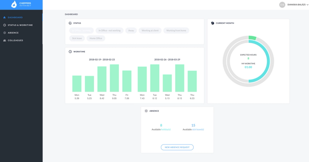 The end result was a Drupal 8 application, where the developers were able to concentrate on implementing and testing the heavy business logic, and a stunning frontend app. Thanks to the decoupling we didn’t have to sync development up, backend and frontend could progress independently.Dashboard showing relevant work activity (and interfaces for triggering home office, and other work statuses):